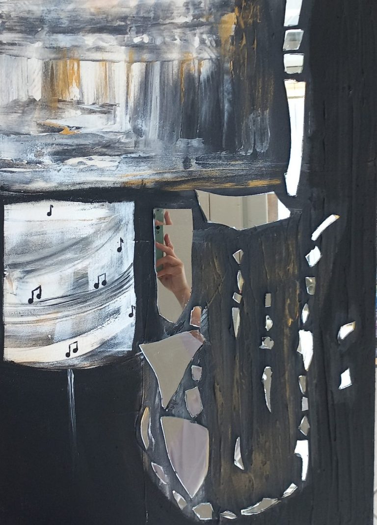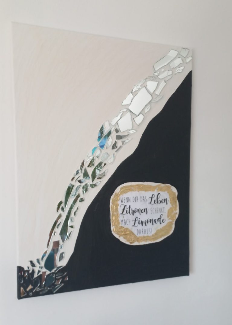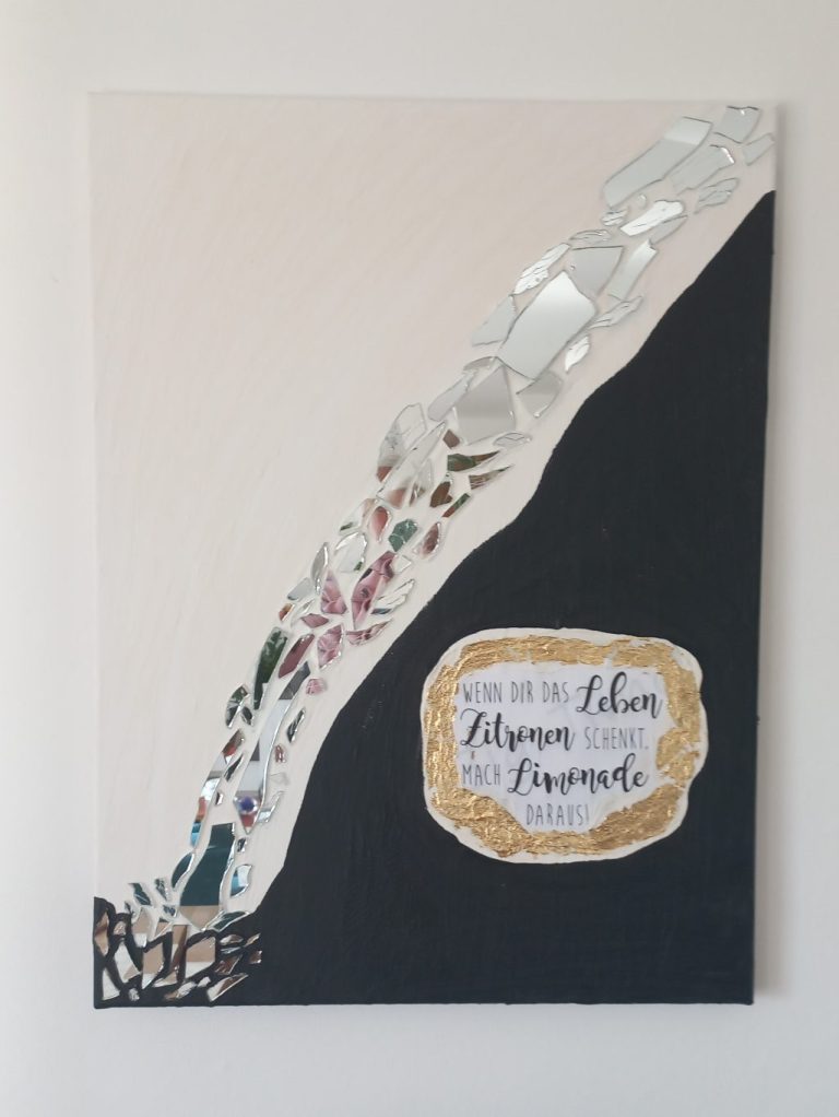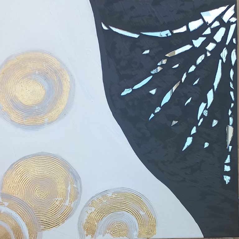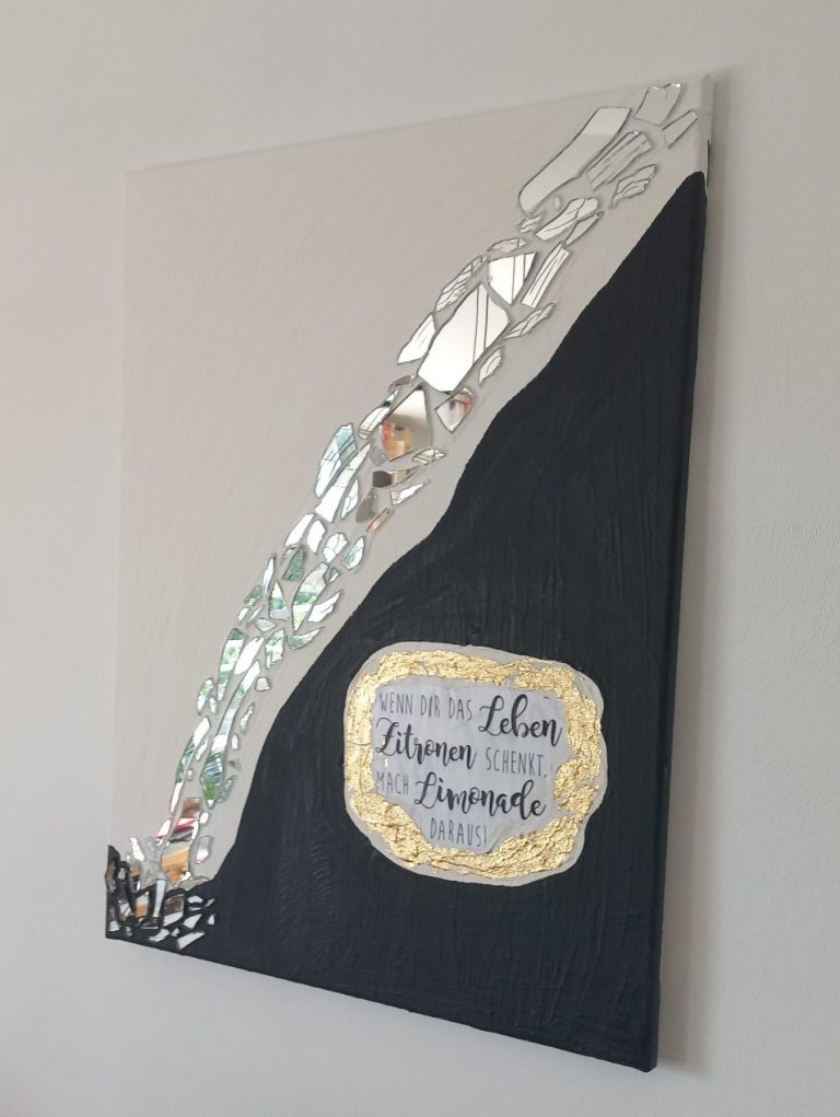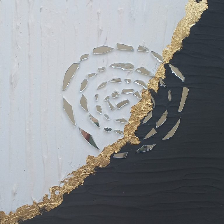 Meine schillernde Spiegelkunst besteht aus strukturierten Acrylbildern in schwarz und weiß bzw. creme mit Goldelementen und eingearbeiteten Spiegelscherben.