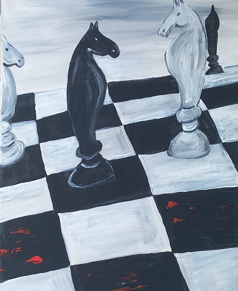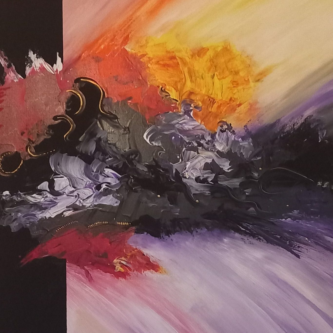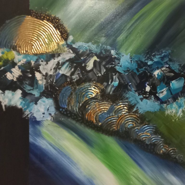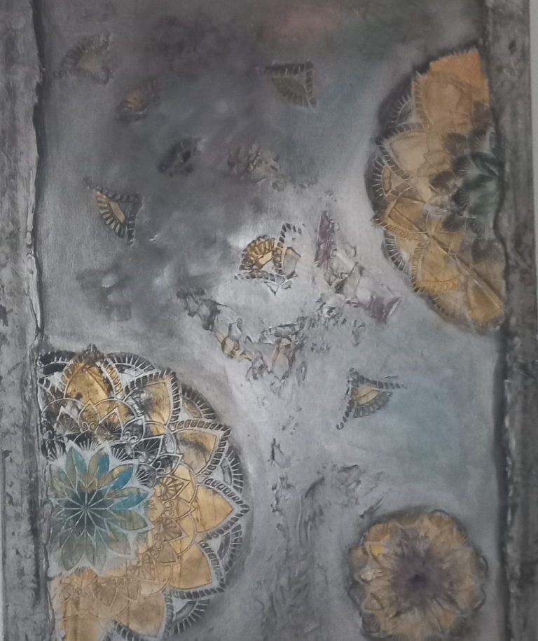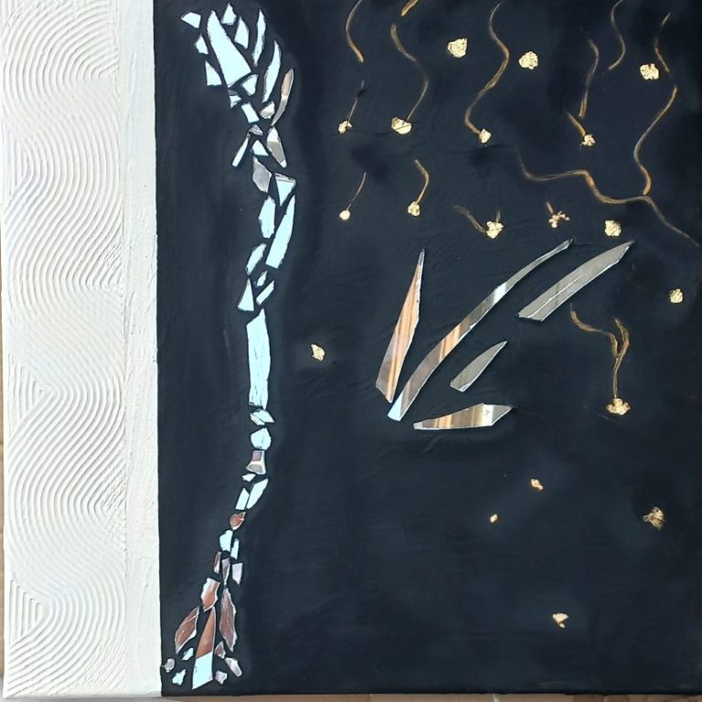 Meine schillernde Spiegelkunst besteht aus strukturierten Acrylbildern in schwarz und weiß bzw. creme mit Goldelementen und eingearbeiteten Spiegelscherben.